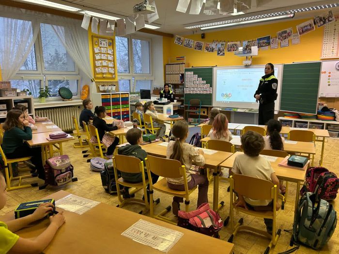 Třídu 1. C v pondělí navštívila městská policie. Dětem poutavou a srozumitelnou formou představila svou práci – ukázala jim, jak vypadá jejich uniforma, v jakém vozidle se po městě pohybují, jaké je jejich telefonní číslo a také je naučila, jak se správně a bezpečně chovat při přecházení silnice. Setkání bylo pro žáky velmi přínosné a obohacující.