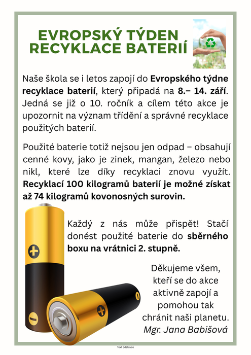 Naše škola se i letos zapojí do Evropského týdne recyklace baterií, který připadá na 8. – 14. září. Jedná se již o 10. ročník a cílem této akce je upozornit na význam třídění a správné recyklace použitých baterií.